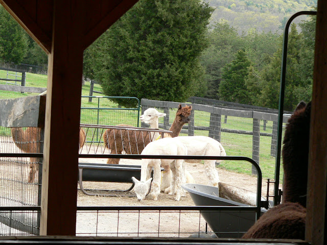 We planned to drive home in time for Saturday's 5:30 mass because Len had to leave early Sunday morning for his spring kayaking trip. He was kind enough to let me follow a billboard down a long, windy road to an alpaca farm. The store was closed (too bad) because it was shearing weekend (cool!).